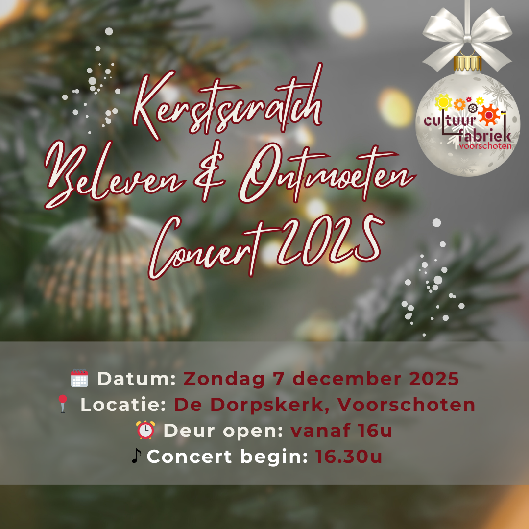 Op zondag 7 december 2025 organiseert de Cultuurfabriek voor de vierde keer de Kerstscratch ‘Beleven en Ontmoeten’ in de Dorpskerk, Kerkplein 2 in Voorschoten. Iets meer dan 70 muzikanten en zangers uit Voorschoten geven een uniek concert in de Dorpskerk. Uniek omdat deze muzikanten en zangers pas vanaf 13.00 uur dezelfde dag het repertoire instuderen. Het concert wordt op 16.30 uur geopend door wethouder Cultuur, Hans van der Elst. De toegang is gratis.