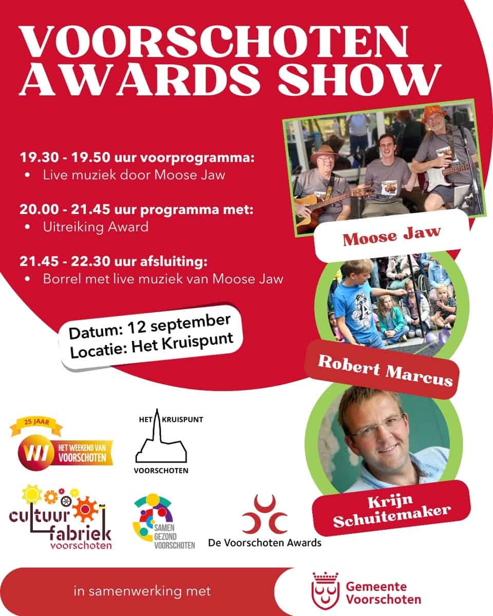 Op vrijdagavond 12 september 2025 worden in de Kruispuntkerk, Schoolstraat 2, voor de derde keer de Voorschoten Awards uitgereikt, in de categorie Cultuur, Sport en Vrijwilligers. De awards show begint om 20.00 uur.
